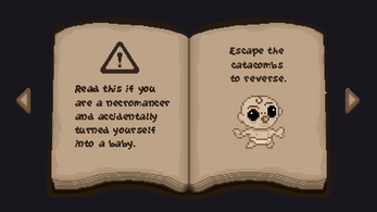 On one of his trips through the catacombs, a necromancer got hit by bad luck. A cursed tomb turned him back into a baby. Curing the curse is easy, but the recipe is still in his tent at the surface.