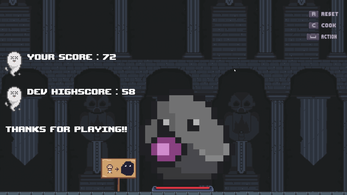 That was some good soup ;). I enjoyed my time with the game. There are, obviously, some kinks that still need to be ironed out, (e.g. QOL in the cooking UI, coyote time would be a nice addition, etc...) but the overall concept is interesting and I look forward to seeing it more ironed out as you guys continue your work on it.
